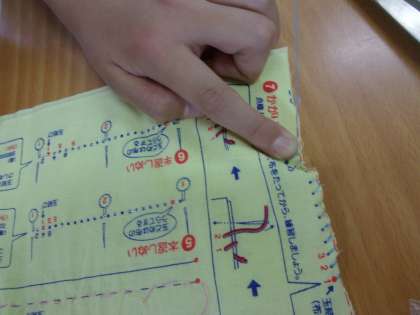 玉結びや玉どめ、裁ちばさみで布を切る学習をしました。