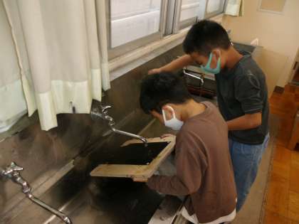 その後、図工室に場所を移し、絵に水溶性のインクをローラーで塗りました。