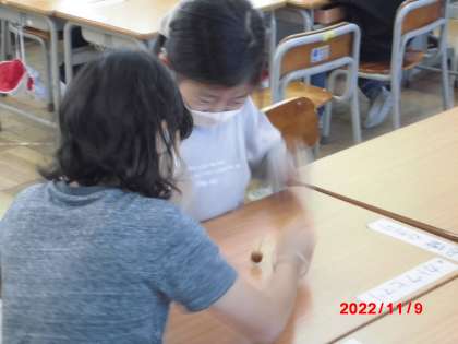 キリを使って慎重にどんぐりに穴をあけ、どんぐりゴマを作りました。どんぐりゴマが回る様子を友達と楽しそうに見ていました。