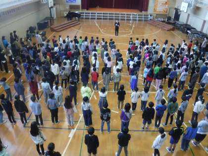 1学期の「大空創立記念コンサート」に引き続き全校学年が集まり、円になって一緒に歌いました。「歌は出会いをつれてくる」の歌詞にあるように、このふれあいコンサートでたくさんの人とふれあえる喜びの気持ちを込めて歌います。サビの歌い出しの「広い大空に」の部分では、空が晴れ渡っていくような美しいメロディーに乗せて、子どもたちの天使の歌声が会場中に響き渡りました。