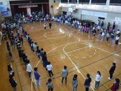太陽も星も雲も虹も全て大空につつまれている。雨も風も自然の現象は、全て大空からのおくりもの。一人ひとりの希望も夢も受け止め、大きく育ててくれるという思いを込めてつくられた歌です。そんなみんなのクラスの名前が入った大切な校歌を教頭先生の指揮に合わせて歌いました。