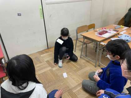 リーダーさんに「ぴょんぴょんカエル」の作り方を教えてもらいました。一緒に絵を書いたり、とばしあいっこをしたりとても楽しい時間を過ごしました。