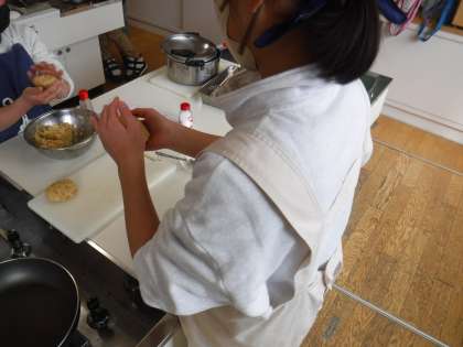 「ジャーマンポテト、ベーコン巻き、ポテバーグ、ポテトサラダ」の4品から何を作るか班で相談し、役割分担をして全員で力を合わせました。
