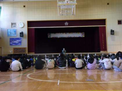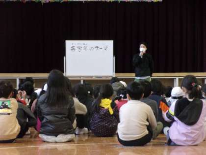 2つ目は、大空サッカークラブが大会で3位になったというお話です。6名の児童が前に出て、表彰されました。