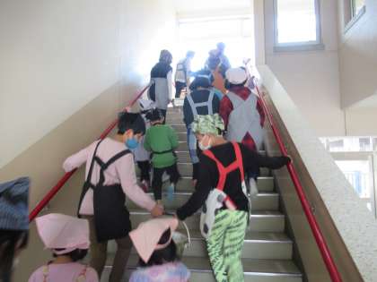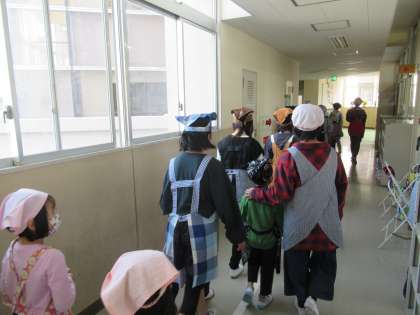 1年生と手をつないで給食室まで一緒に歩いているリーダーたちの背中がとても大きく見えました。