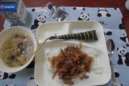 今日はこどもの日献立で、「きんぴらちらし」に「すまし汁」、「ちまき」が出ました!