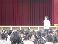 一緒に学んできた二人の教育実習生が子どもたちの前に出ます。教育実習は今日で終わります。今回、大空小で学んだ「授業での学び合い・遊んだこと・運動会の学習・日常での関わり合い」などを生かして、全力でがんばる教職員になってください!