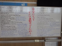 今日のテーマは、「自分にとってどんな運動会でしたか?」です。子どもも大人も一人一人が自分の考えをもって、グループに分かれます。今日は、低学年の子どもたちも積極的に発表します。お互いの考えを聞き合いながら、自分の考えを深めていきます。