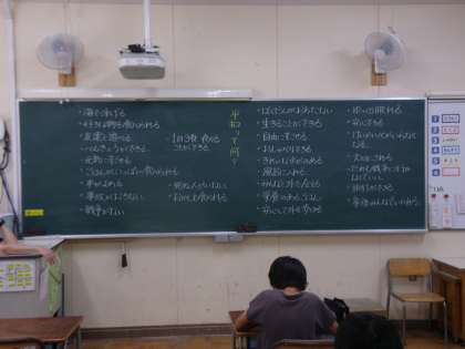 先日行われた平和学習のことを思い出したり、自分たちの生活を振り返ったりしながら、平和とは何なのかを考えました。
