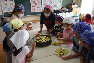 講堂で楽しんだ後は、教室に帰り、朝につくったおいもを1・2年生とサポーターさんなどみんなで食べました。