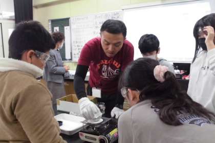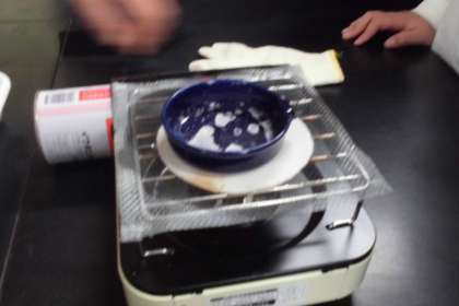 水にとけた食塩やミョウバンは取り出すことができるのでしょうか?ガスコンロに火をつけて、さあ実験のはじまりです。