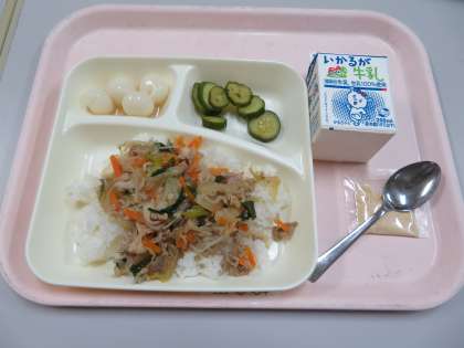 ・豚丼 ・きゅうりの梅風味 ・白玉だんご ・きな粉(袋・白玉だんご)