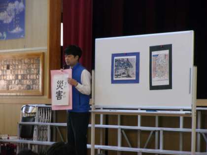 校長先生からは災害について、もし大和川が氾濫したらどうなるかについてお話がありました。