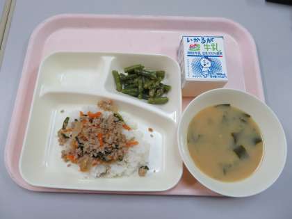 ・豚ひき肉とにらのそぼろ丼 ・牛乳 ・じゃがいものみそ汁 ・さんどまめのごまあえ