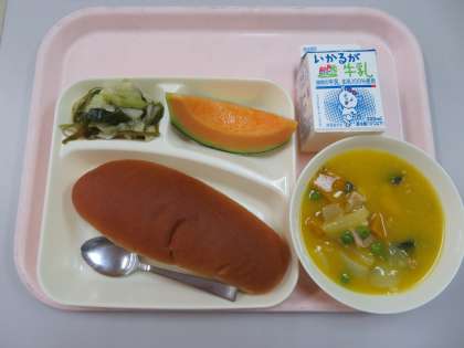 ・こくとうパン ・牛乳 ・鶏肉とかぼちゃのシチュー ・ミックス海そうのサラダ ・クインシーメロン