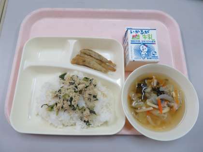 ・ごはん ・牛乳 ・いわしてんぷら ・五目汁 ・とりなっ葉いため
