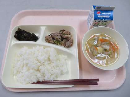 ・ごはん ・牛乳 ・豚肉の梅風味焼き ・五目汁 ・のりのつくだ煮