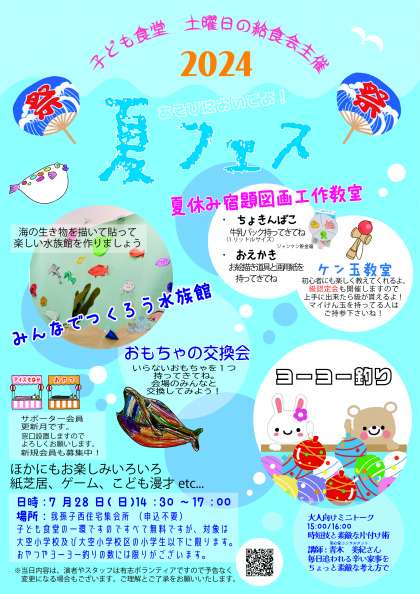 子ども食堂 土曜日の給食会主催の「夏フェス」が開催されます。