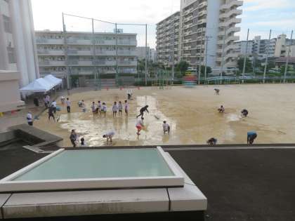 水遊びのあとも卒業生、はぐくみさん、サポーターさんで水風船の後片付けをしてくれています。割れた水風船を一つずつ拾ってくれています。