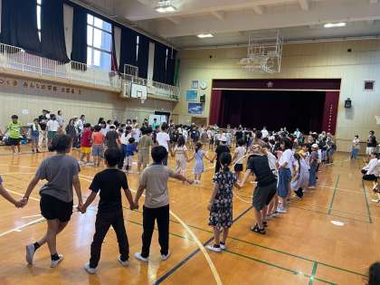 みんなで手をつないで「わ」をつくり、そこにフラフープを通していくチャレンジ!