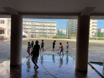 使用した学校を朝から掃除しています。