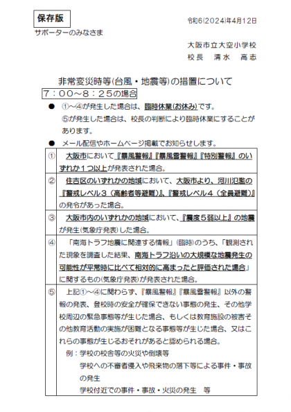 台風10号の接近に伴い、8月27日(火)は臨時休業や緊急下校の可能性があります。臨時休業の基準については、先日配布している「非常変災時の措置について」にてご確認ください。資料も掲載しています。