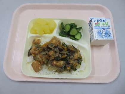 ・牛乳 ・マーボーあつあげ丼 ・あっさりきゅうり ・りんご(カット缶)