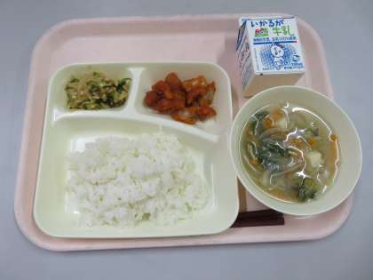 ・ごはん ・牛乳 ・ヤンニョムチキン ・とうふのスープ ・切干しだいこんのナムル