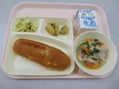 ・おさつパン ・牛乳 ・鶏肉のカレー風味焼き ・スープ煮 ・野菜のソテー