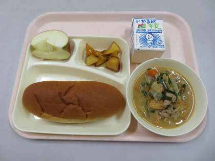 ・こくとうパン ・牛乳 ・中華煮 ・大学いも ・りんご