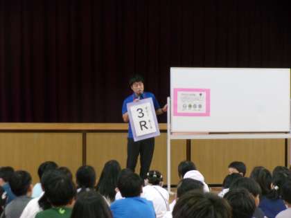 校長先生から「3R」のお話がありました。どうすることが3Rにつながるのかを考えました。「地球にやさしい取り組み」10月は3R推進月間です!