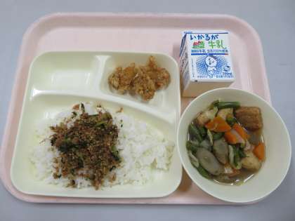 ・ごはん ・牛乳 ・鶏肉のたつたあげ ・あつあげと野菜の煮もの ・おかかなっ葉