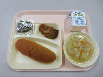 ・黒糖パン ・牛乳 ・なすのミートグラタン ・鶏肉とキャベツのスープ ・ミニフィッシュ