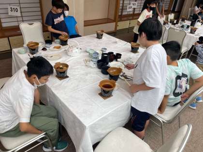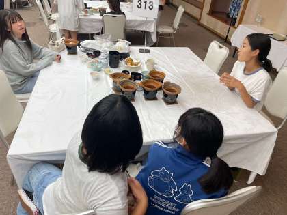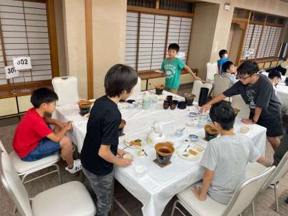 夕ご飯もおいしいいただきました。片づけは部屋班メンバーと協力して同じ食器にきれいに揃えました。
