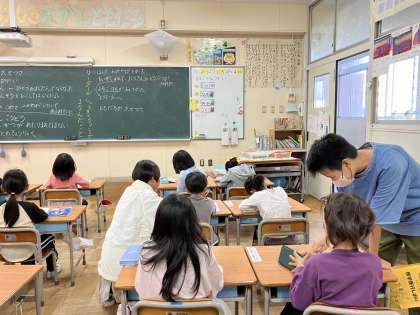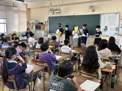 リーダーが各クラスで、修学旅行で学んだことを伝える様子です。