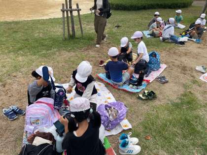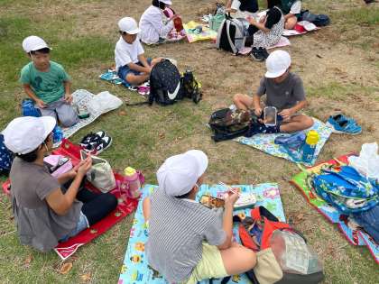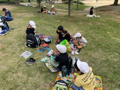 扇町公園でお弁当を食べています。とても歩いたのでお腹がすきました。