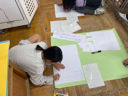 4年 国語科「和と洋新聞を作ろう」の授業風景です。タブレットをフル活用しながらインタビューをした内容などを壁新聞にまとめています。