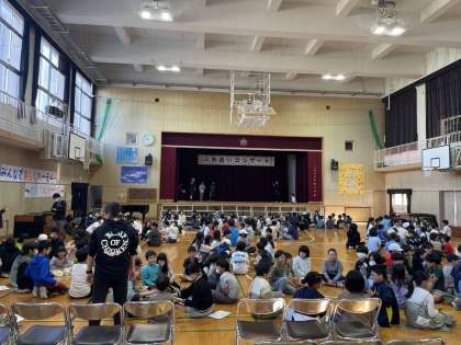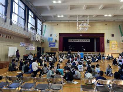 今日の集会はボール回しゲームでした。音楽が出なかったため、先生のアカペラの歌に合わせて、楽しくボール回しをしました。