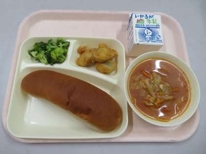 ・こくとうパン ・牛乳 ・白身魚フリッター ・ミネストローネ ・ブロッコリーのサラダ