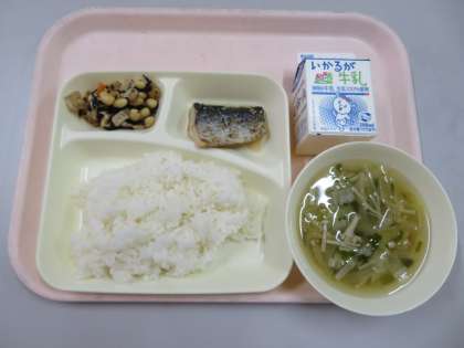 ・ごはん ・牛乳 ・さごしのごまじょうゆかけ ・すまし汁 ・大豆の煮もの