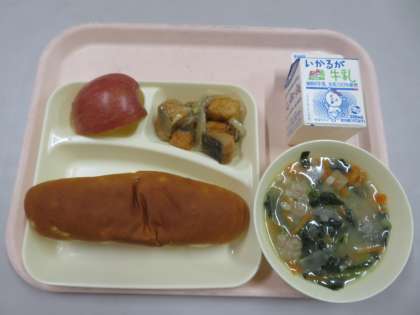 ・おさつパン ・牛乳 ・さけのマリネ ・肉だんごと押麦のスープ ・りんご