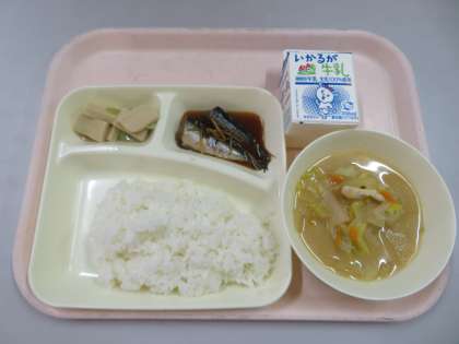・ごはん ・牛乳 ・いわしのしょうが煮 ・みそ汁 ・高野どうふの煮もの