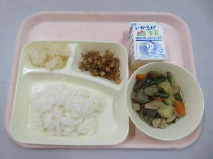 ・ごはん ・牛乳 ・鶏肉と野菜の煮もの ・じゃこ豆 ・かぶのゆず風味