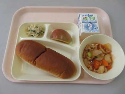 ・こくとうパン ・牛乳 ・ケチャップ煮 ・ささみと野菜のソテー ・りんご