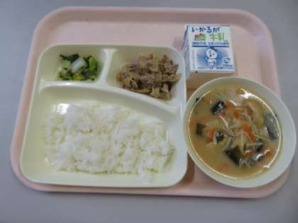 ・ごはん ・牛乳 ・豚肉のごまだれ焼き ・みそ汁 ・きくなとはくさいのおひたし