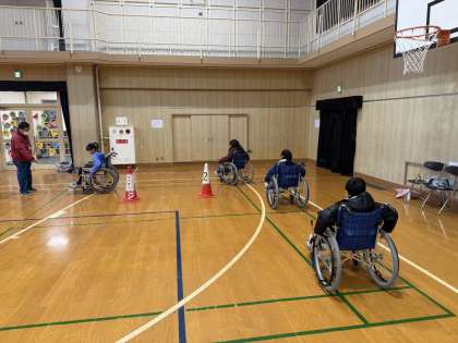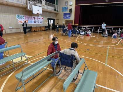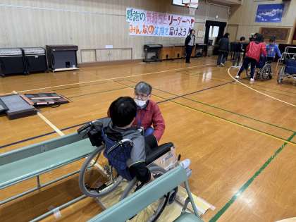 大阪市立心身障がい者リハビリテーションセンターの皆さんをお迎えして車いす体験を行いました。わずか2センチメートルの段差ですが車いすで乗り越えることが難しく、介助の必要性を体験しました。