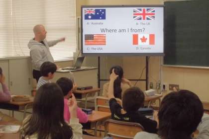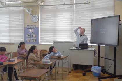 新しく大空小に来られたC-Netのスティーヴ先生の「自己紹介クイズ」の様子です。どこの国出身で、どんなものが好きなのか、
