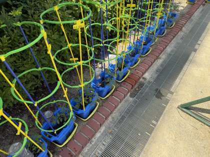 2年生 プチトマトの栽培で水やりをしています。今日はとても暑いのでたっぷりと水をあげましょう。