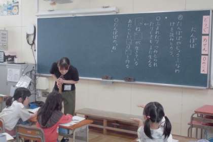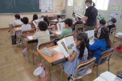 たんぽぽがじょうぶなわけを読み取りました。地面の下には1メートル以上の根が伸びていると知り、先生の1メートルものさしを見て、その長さに驚いていました。