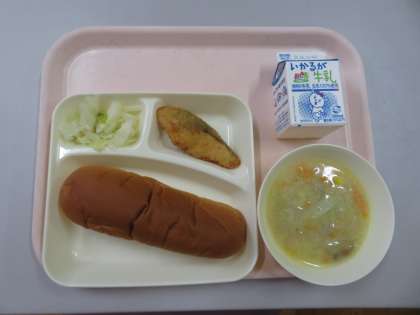 ・黒糖パン ・牛乳 ・サーモンフライ ・豆乳スープ ・キャベツのゆずドレッシング